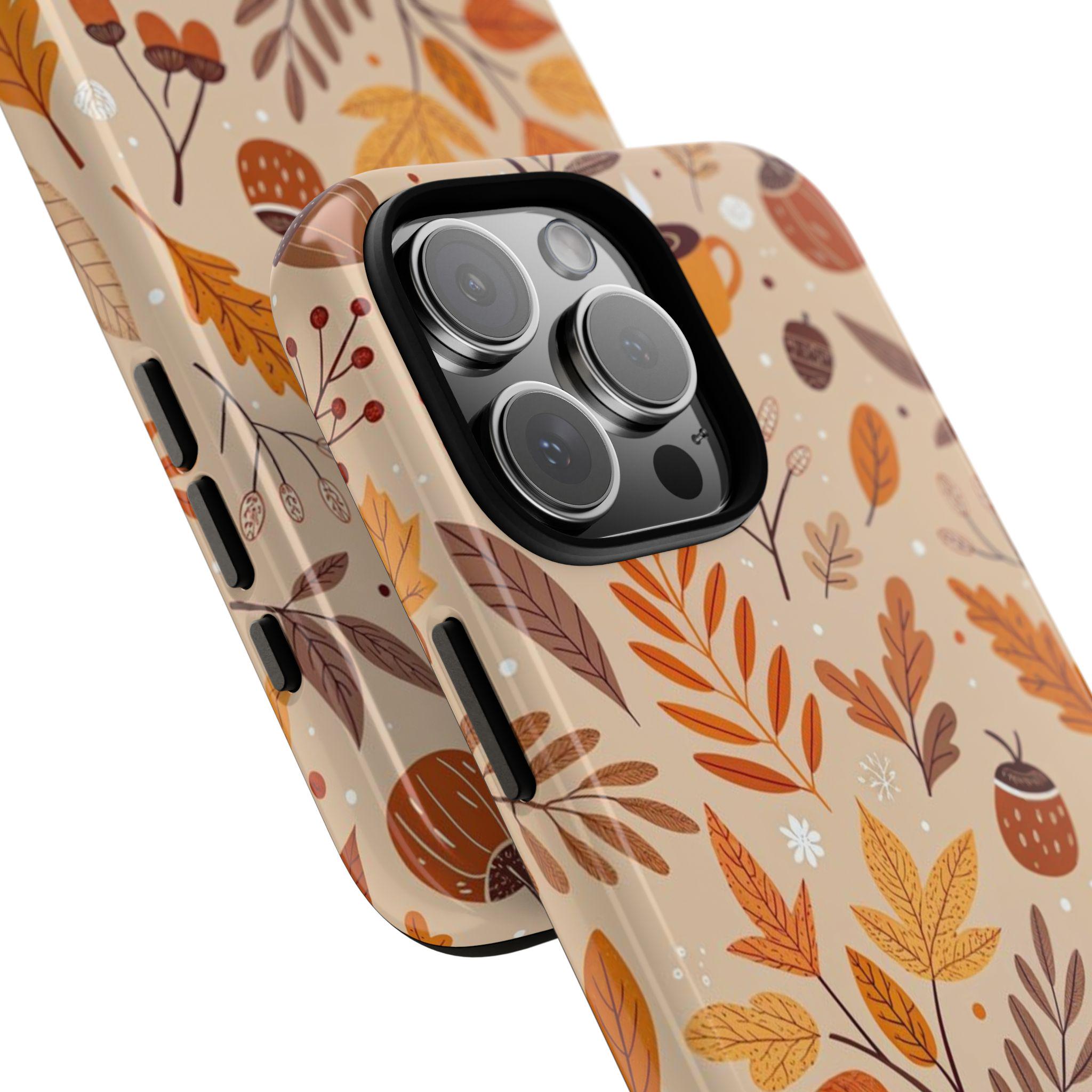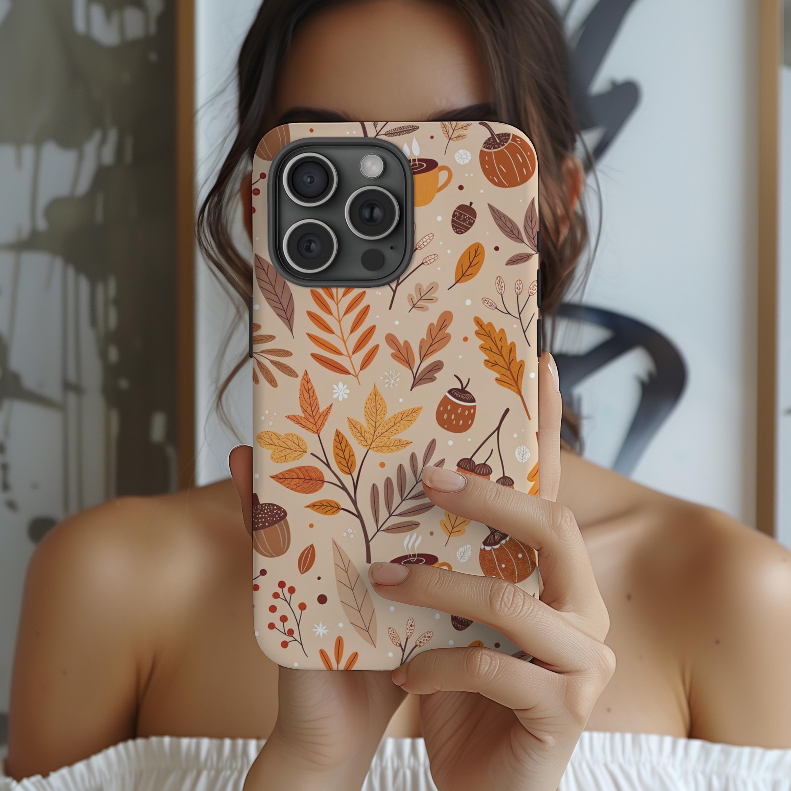 Designed with rich, earthy tones—think warm oranges, spiced browns, and creamy latte swirls—this case features an artfully illustrated pumpkin spice latte, complete with whipped cream, cinnamon sticks, falling leaves, and tiny pumpkins dancing around the cup. Subtle fall-themed accents like acorns, plaid scarves, and golden leaves add a whimsical touch, making it a must-have accessory for any autumn enthusiast.