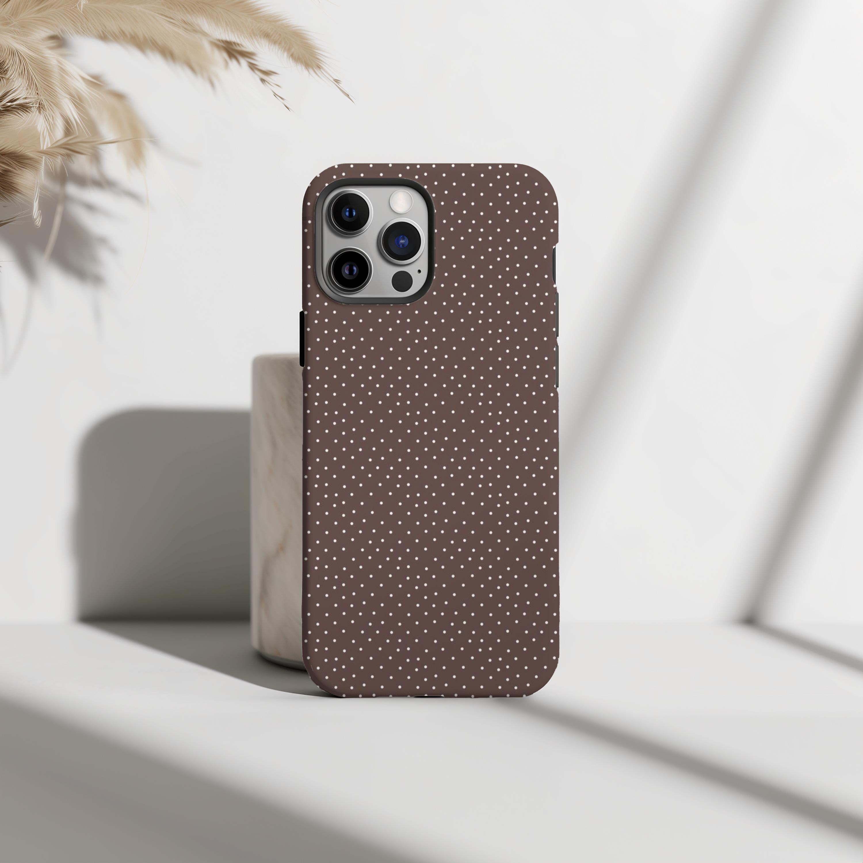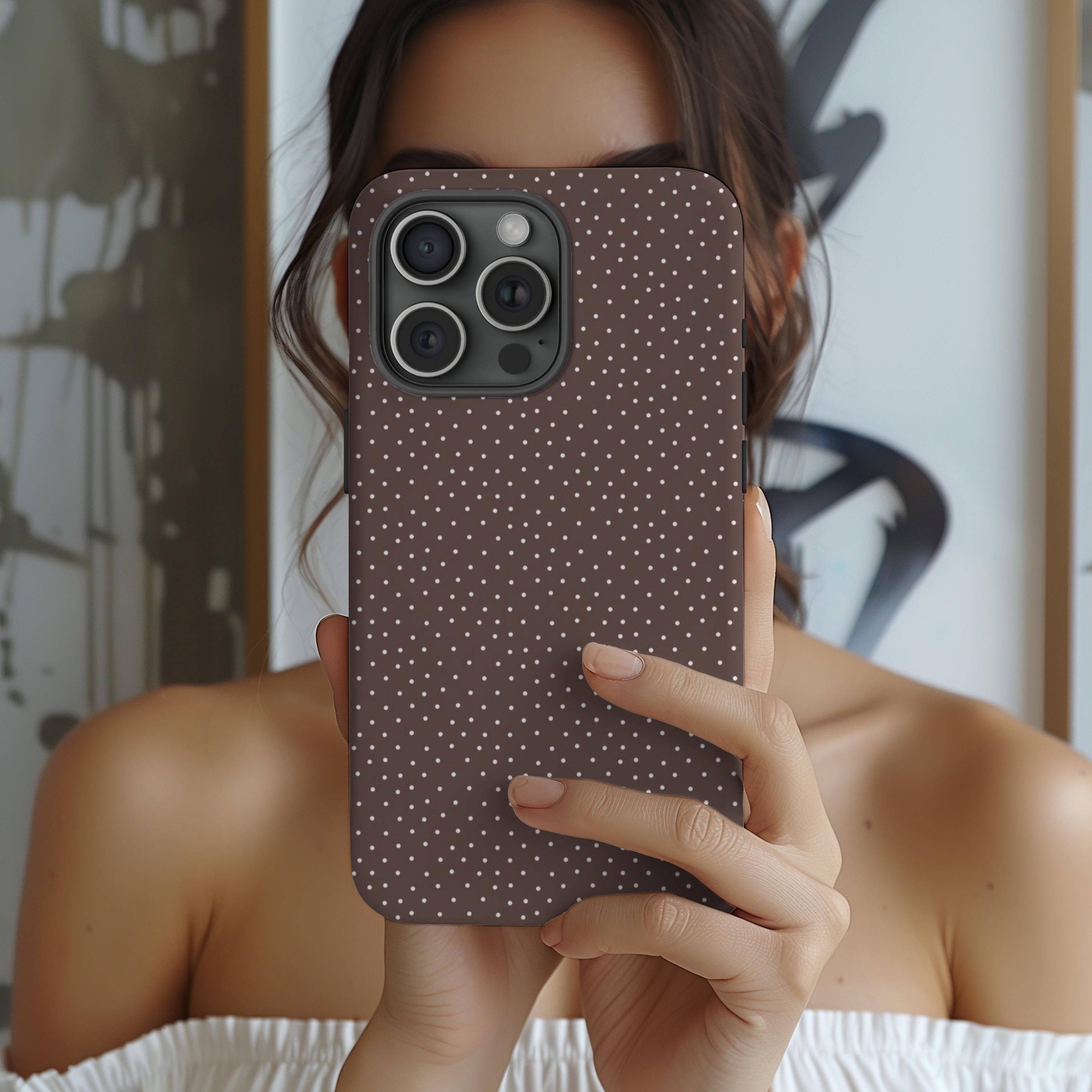 The case features a warm, chocolate-brown background that exudes richness and sophistication, beautifully accented with soft blush-pink polka dots for a sweet, flirty contrast. This vintage-inspired pattern captures the essence of old-Hollywood glamour while staying true to the coquette aesthetic — romantic, dainty, and effortlessly chic.