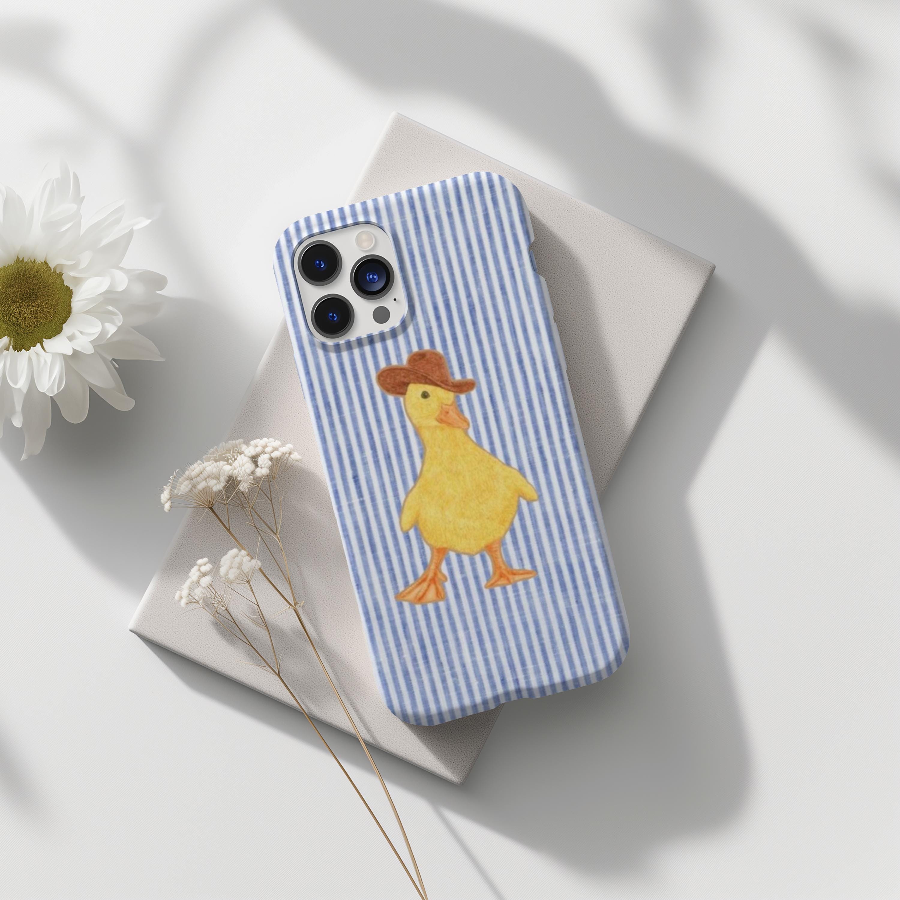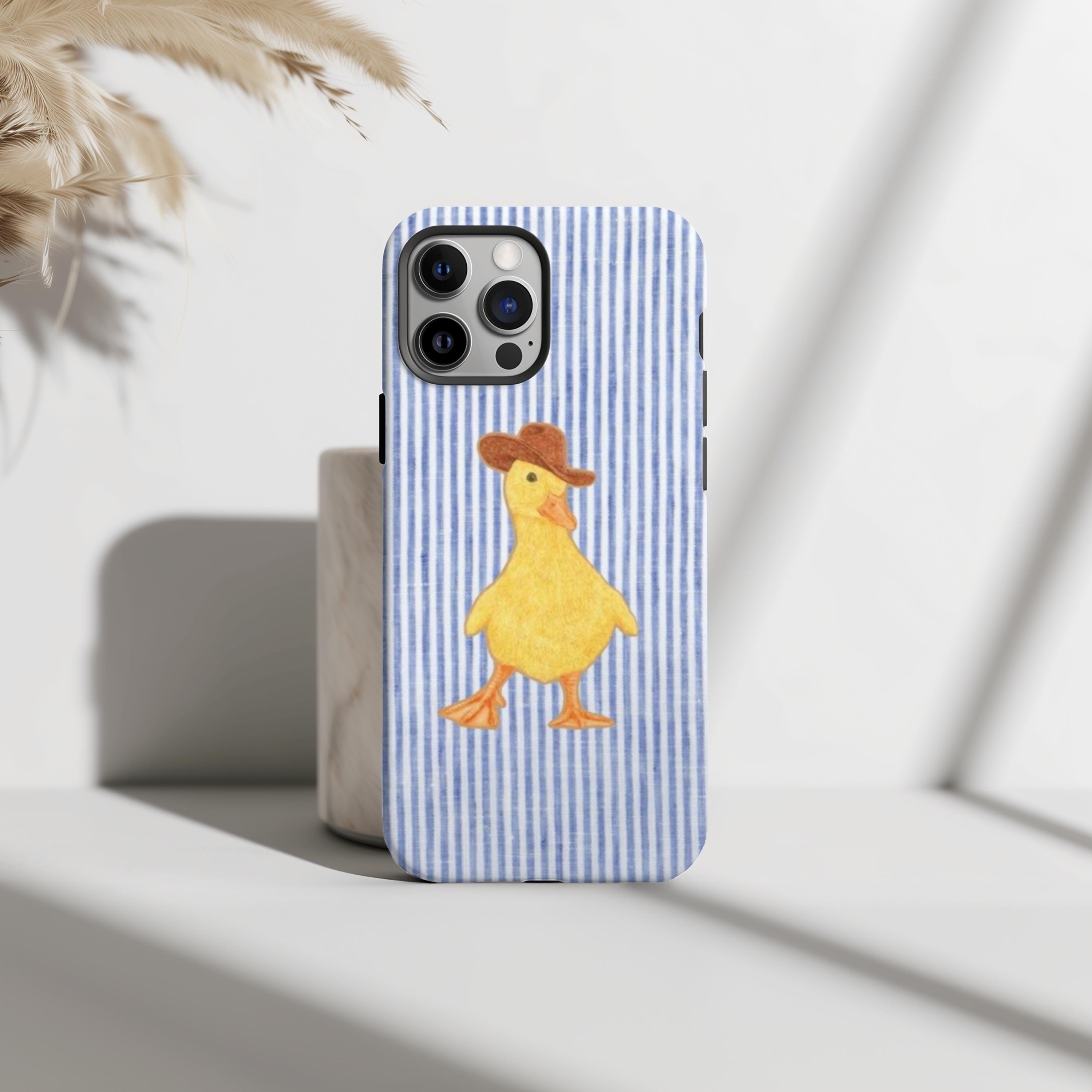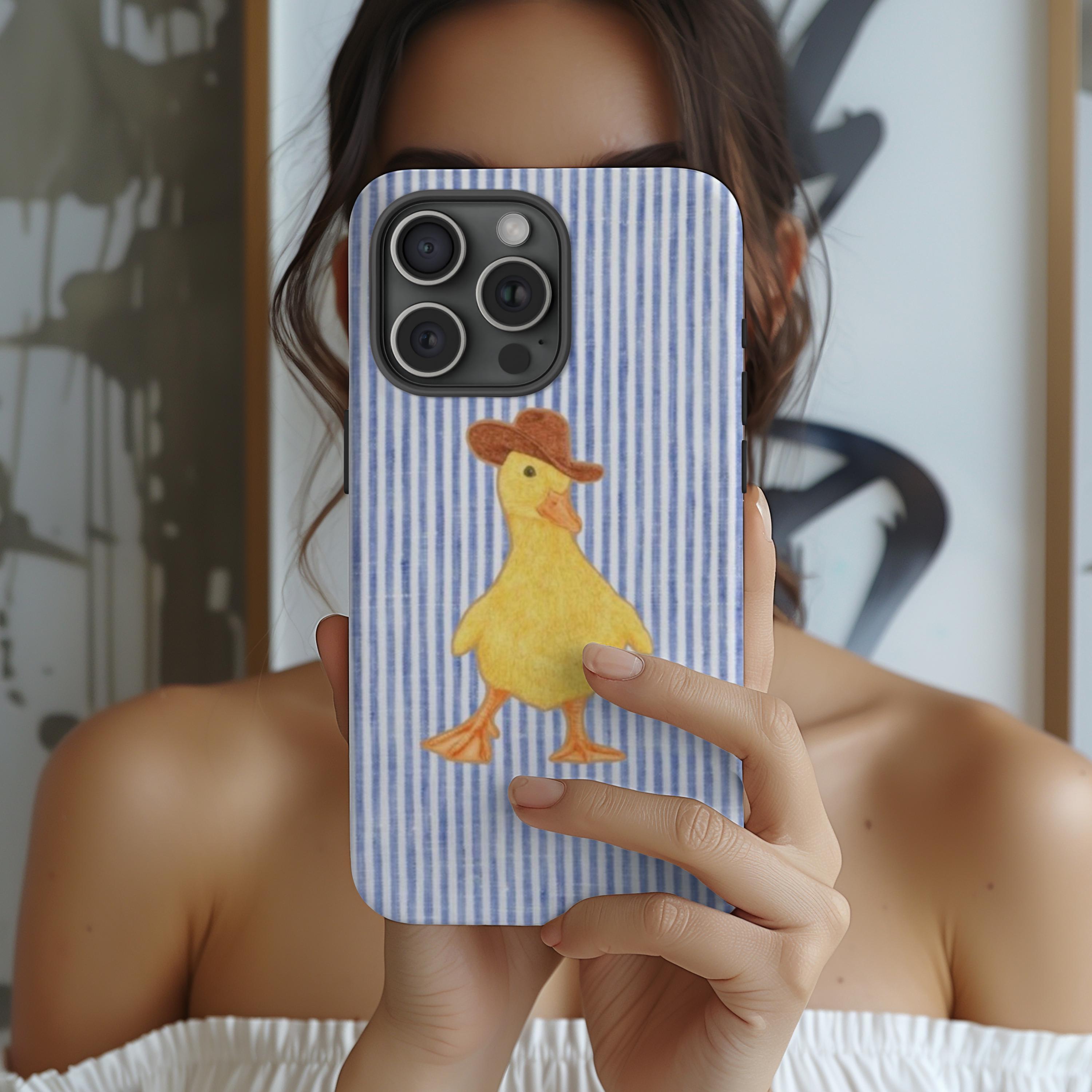 Bring playful charm and cozy countryside vibes to your everyday essentials with this Blue Striped Denim Duck Phone Protective Case. Featuring an adorable yellow duckling wearing a tiny brown cowboy-style hat, set against a soft blue striped denim-inspired background, this phone case blends cute cottagecore style with a touch of whimsical western flair. The hand-drawn look and gentle pastel tones create a sweet, vintage-inspired aesthetic that feels both trendy and timeless.