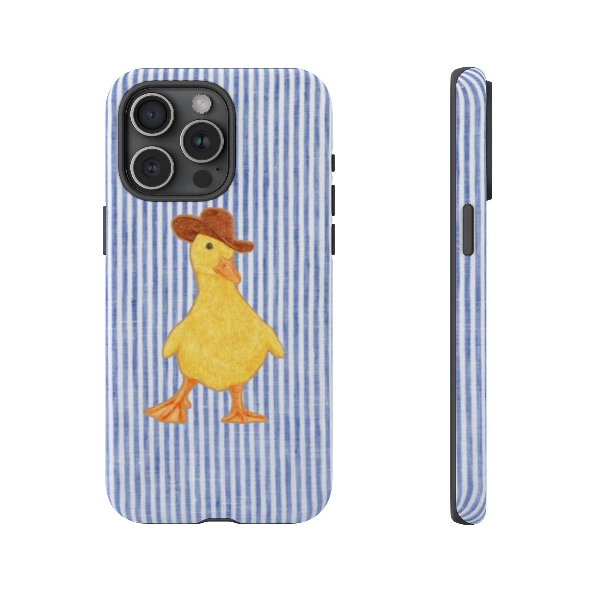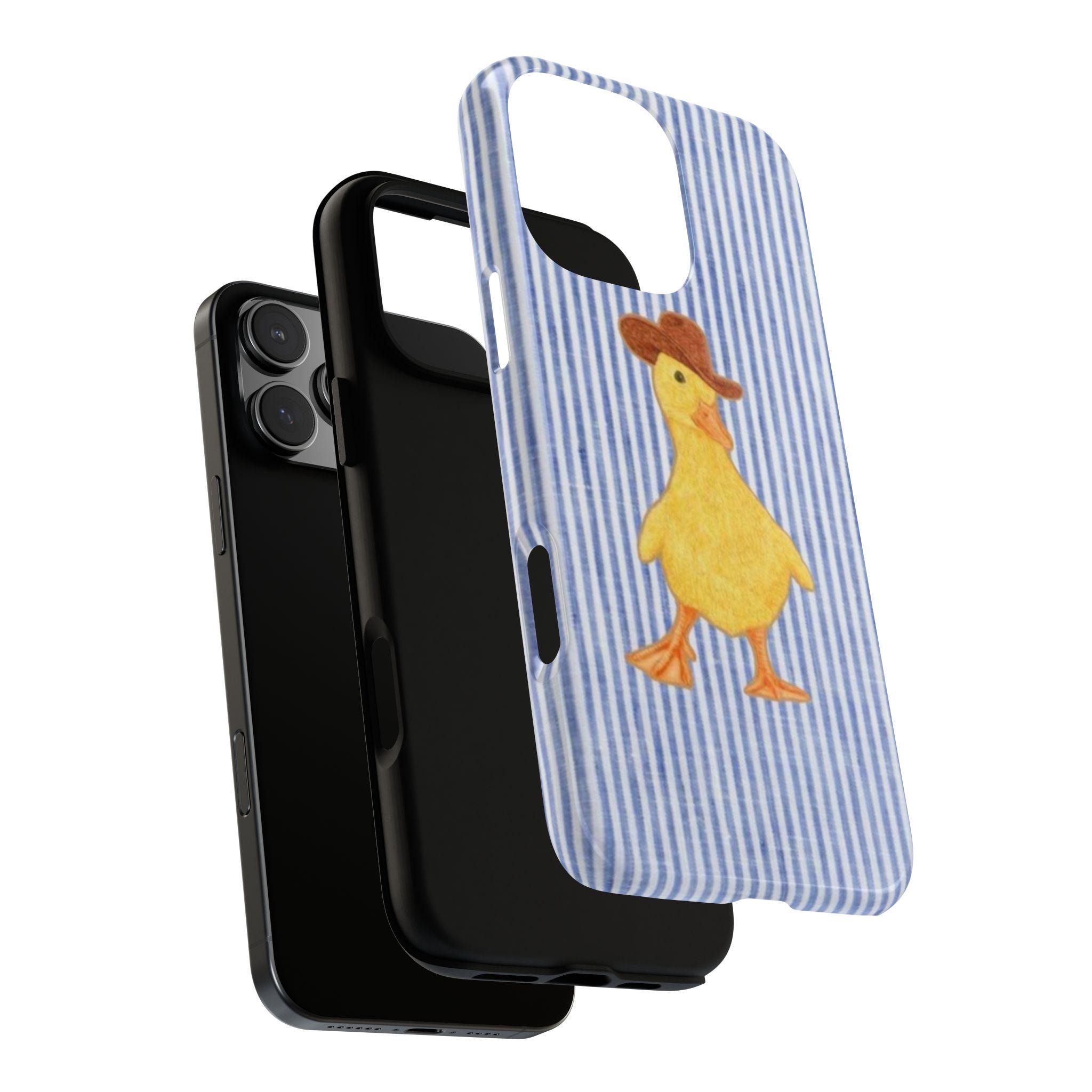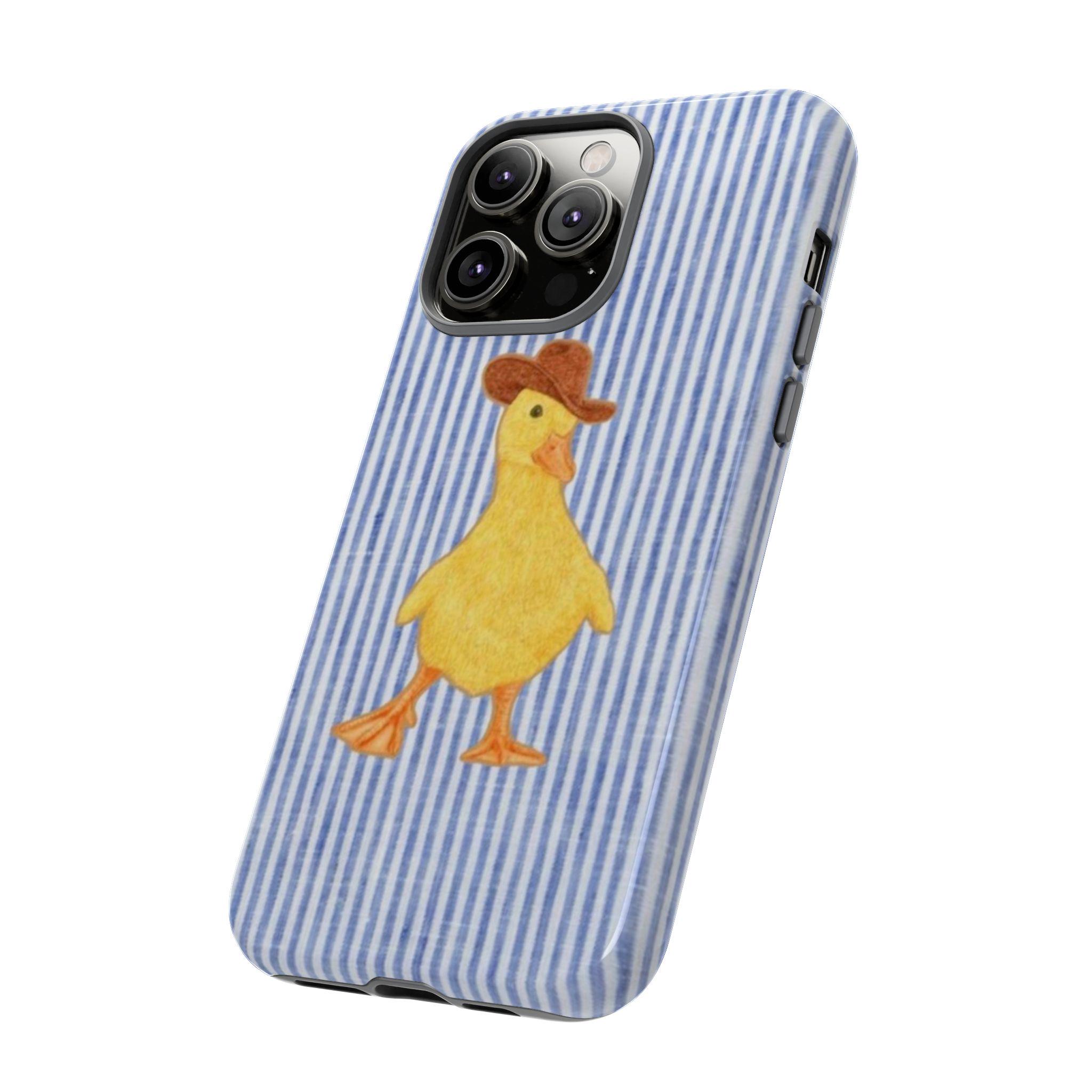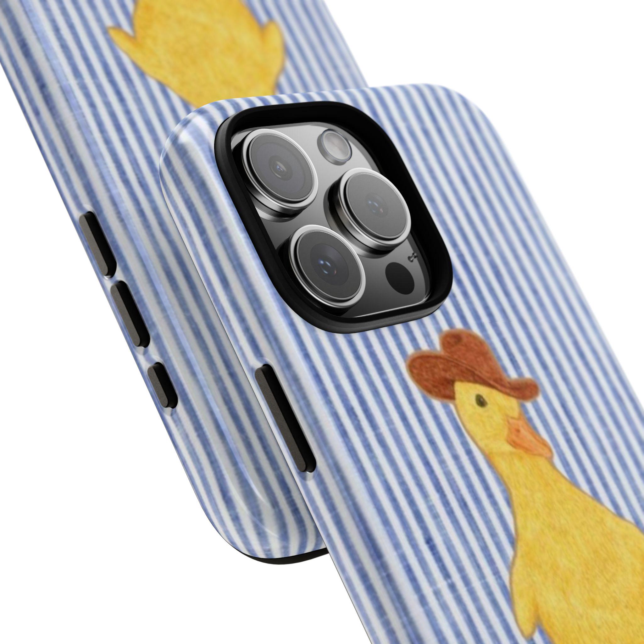 Bring playful charm and cozy countryside vibes to your everyday essentials with this Blue Striped Denim Duck Phone Protective Case. Featuring an adorable yellow duckling wearing a tiny brown cowboy-style hat, set against a soft blue striped denim-inspired background, this phone case blends cute cottagecore style with a touch of whimsical western flair. The hand-drawn look and gentle pastel tones create a sweet, vintage-inspired aesthetic that feels both trendy and timeless.